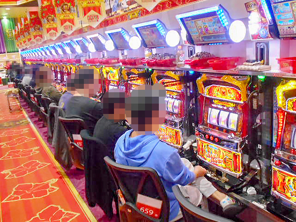 5円パチスロは機種を問わず好評の様子。楽しそうにレバーを叩くプレイヤーが多かった。