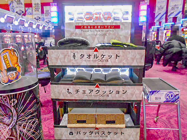 店内にはブランケットやクッションなどが用意されており、より快適な環境で遊技を楽しめるようになっている。