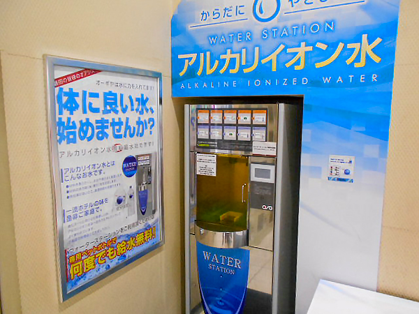 同店はアルカリイオン水の自動販売機も完備。専用ペットボトルがあれば無料で給水できるとあって、多くのプレイヤーが利用していた。