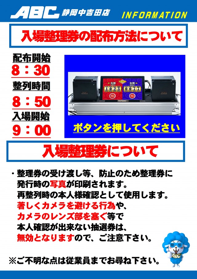 8:30迄にお並び頂いた方に順不同の整理券をお配りします。 |