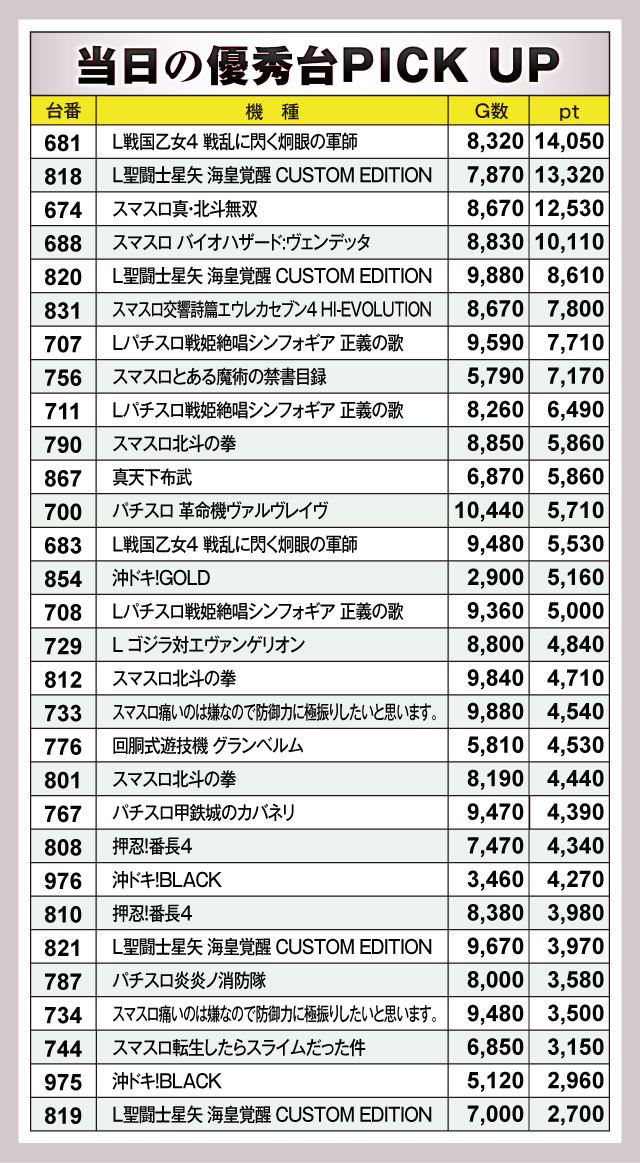 この日は681番台、818番台、674番台、688番台が万枚オーバーを達成!なかでも『L戦国乙女4 戦乱に閃く炯眼の軍師』は+14,050ptと素晴らしい結果を残している。