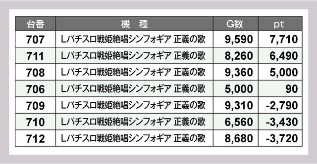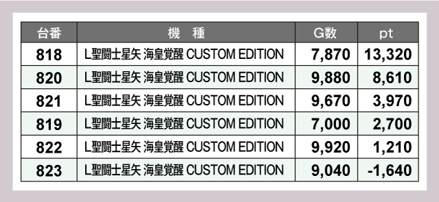 そのほかPickUpしたのは全台系3機種。『L聖闘士星矢 海皇覚醒 CUSTOM EDITION』は818番台+13,320pt、820番台+8,610ptと圧巻のパフォーマンスを披露していた。