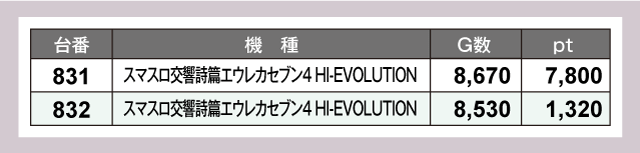 さらに『スマスロ交響詩篇エウレカセブン4 HI-EVOLUTION』も微笑ましい状況。831番台が+7,800ptと凄まじい爆発力で周囲の視線を集めていた。