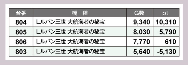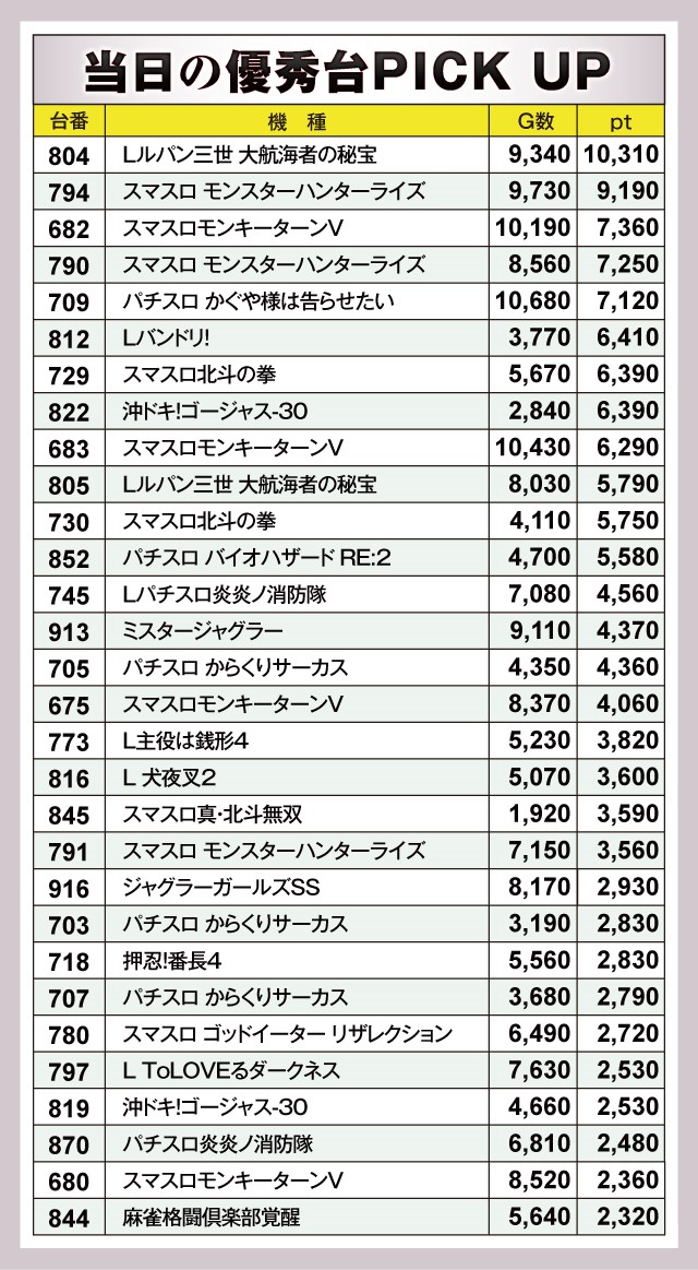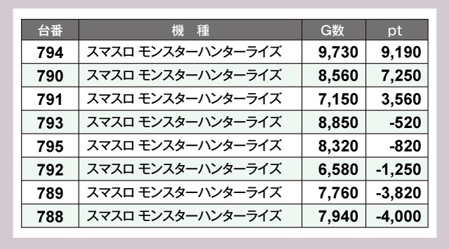 店内をチェックすると、804番台『Lルパン三世 大航海者の秘宝』の+10,310ptを筆頭に、794番台『スマスロ モンスターハンターライズ』は+9,190pt、682番台『スマスロモンキーターンV』は+7,360ptと素晴らしい結果を残している。