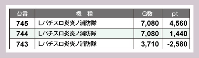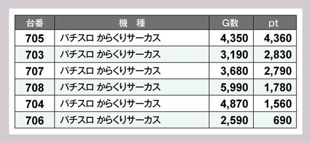 『パチスロ からくりサーカス』は6台すべてがプラスで終了。4桁ptの好調台が続出していた。