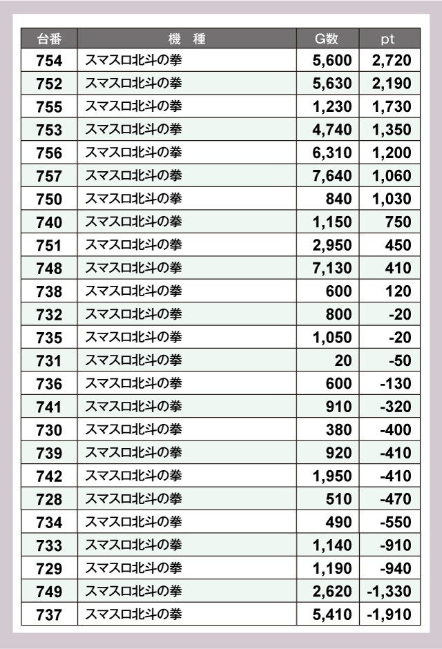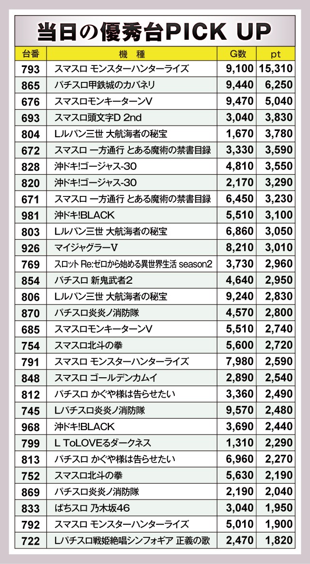 この日は793番台『スマスロ モンスターハンターライズ』が唯一の1万ptオーバーを達成!+15,310ptと圧巻のパフォーマンスを披露している。スマスロだけでなくメダル機からも優秀台が続出しており、スロットコーナーは大盛り上がりとなっていた。