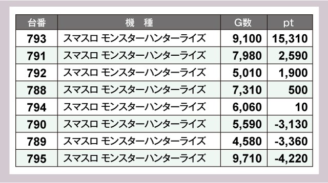 そして、ひときわ目を引いたのが『スマスロ モンスターハンターライズ』。793番台は+15,310ptと素晴らしい結果を残している。