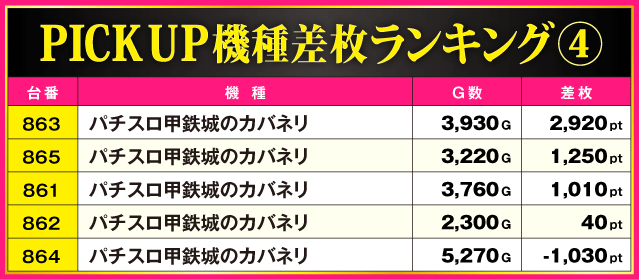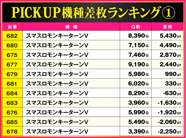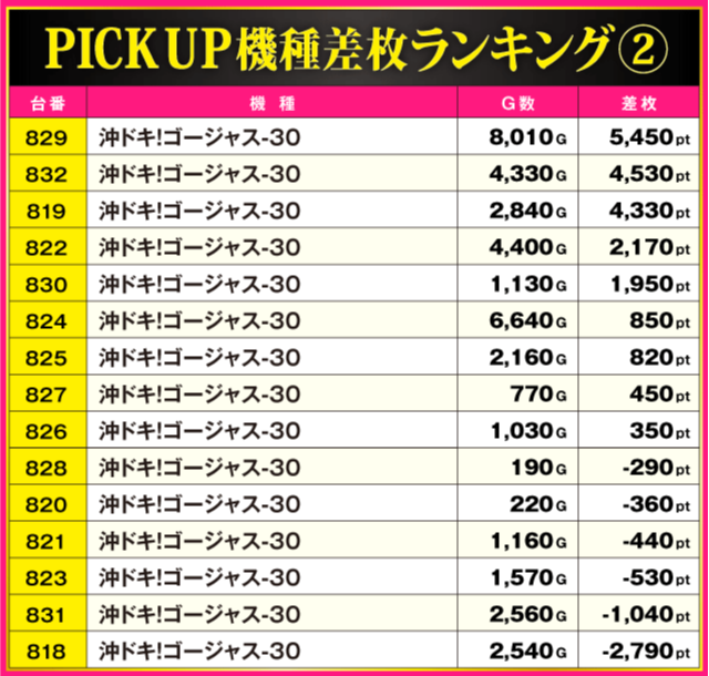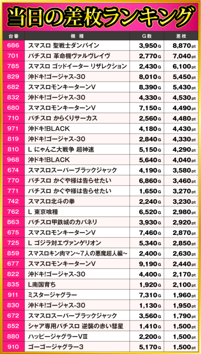 続いてPICK UP機種の状況をチェックしてみよう。『スマスロモンキーターンV』と『沖ドキ!ゴージャス-30』からは+5,000pt超を筆頭に+2,000枚超の台が多数発生。また、『スマスロスーパーブラックジャック』と『パチスロ甲鉄城のカバネリ』は半数以上の台がプラス差枚で終了する見事な結果を残している。