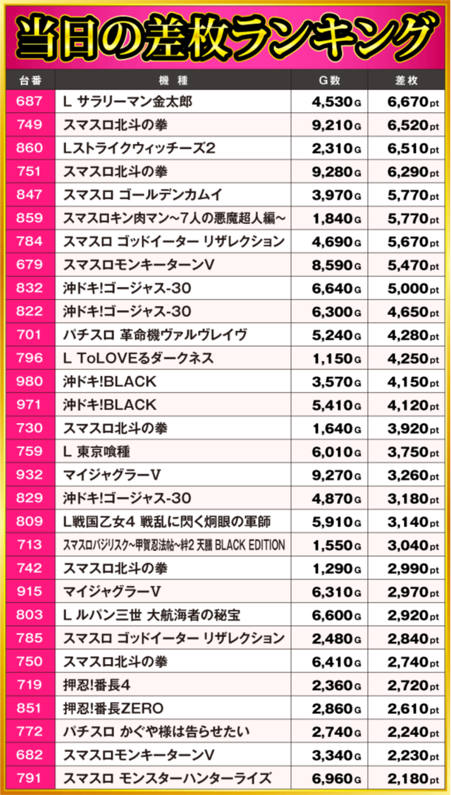 この日は、人気のスマスロを中心に+5,000pt超の台が続出!! そんな中、『L サラリーマン金太郎』が+6,670ptを記録しランキングトップになった。また、『Lストライクウィッチーズ2』からも+6,000pt超が発生しており、メイン機種だけでなく少台数機種からも好成績が確認されている点は注目すべきポイントと言えるだろう。