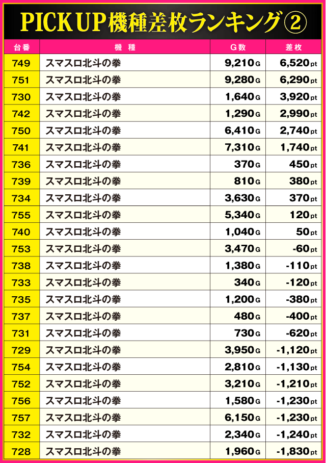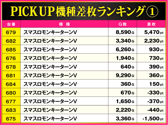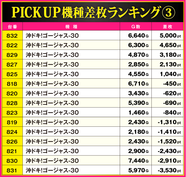 続いてPICK UP機種の状況をチェックしてみよう。『スマスロモンキーターンV』は全11台中7台がプラス差枚で終了、『スマスロ北斗の拳』からは+6,000pt超が2台も飛び出している。さらに、『沖ドキ!ゴージャス-30』も832番台の+5,000pt、822番台の+4,650ptといったハイスコアが発生しシマ内を盛り上げていた。