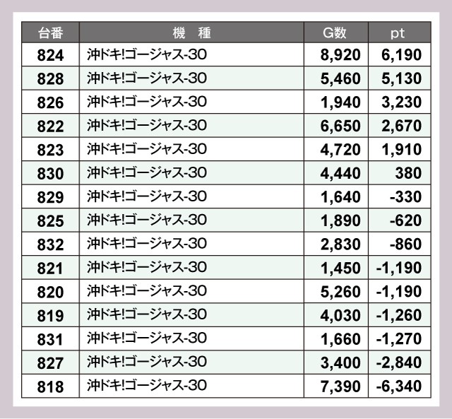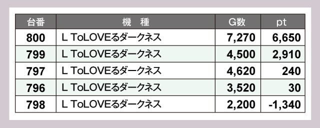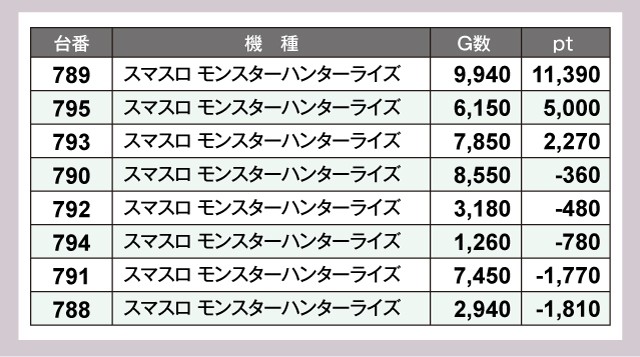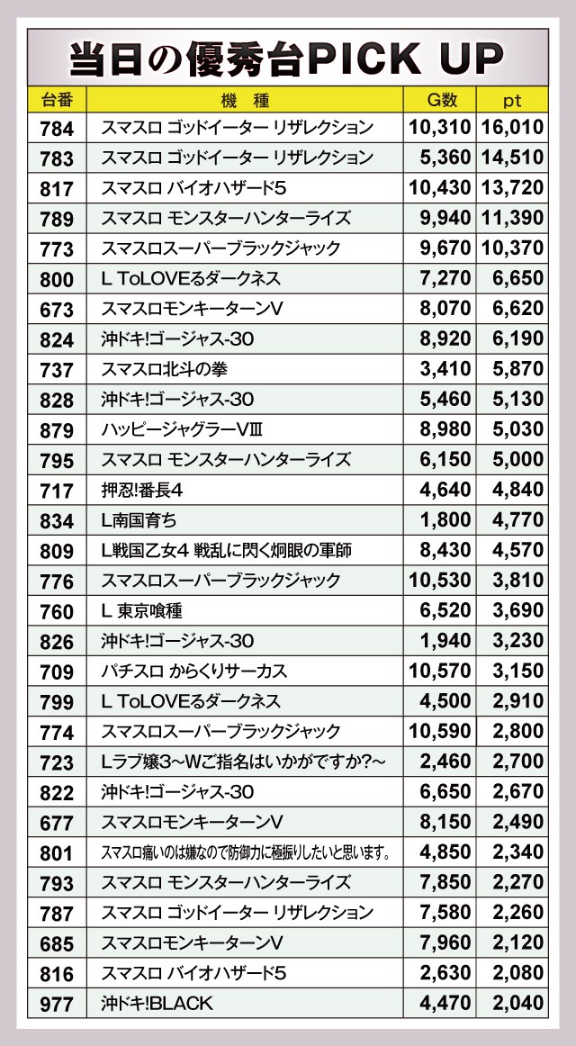 ほかにも『スマスロ モンスターハンターライズ』+11,390pt、『L ToLOVEるダークネス』+6,650pt、『沖ドキ!ゴージャス-30』+6,190ptなど、至る所に優秀台が誕生していた。