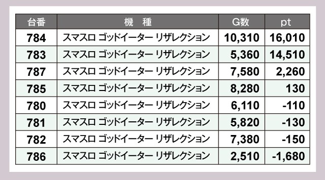 続いては優秀機種を見てみよう。『スマスロ ゴッドイーター リザレクション』は784番台+16,010pt、783番台+14,510ptと圧巻のパフォーマンスを披露していた。