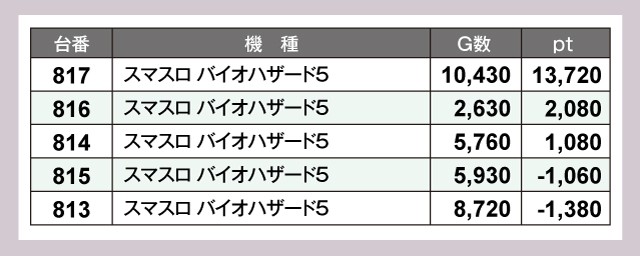 『スマスロ バイオハザード5』は5台中3台がプラスで、817番台は+13,720ptと凄まじい破壊力を見せつけた。