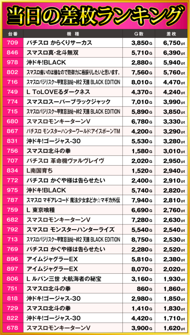当日の差枚ランキング