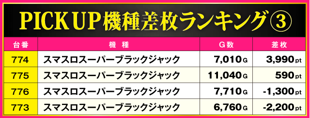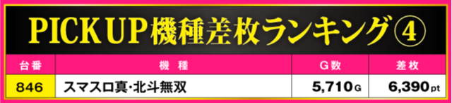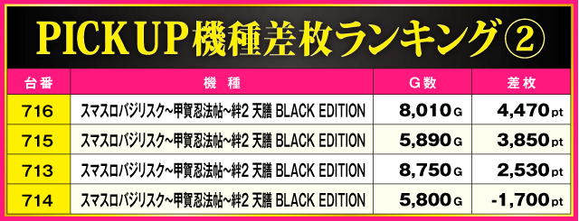 次にPICK UP機種をチェックしていこう。『スマスロ真・北斗無双』の+6,390ptを筆頭に各機種で好成績が確認されているが、特に目立っていたのが『スマスロバジリスク~甲賀忍法帖~絆2 天膳 BLACK EDITION』。716番台の+4,470ptを筆頭に全4台中3台がプラス差枚となる見事な結果を残している。