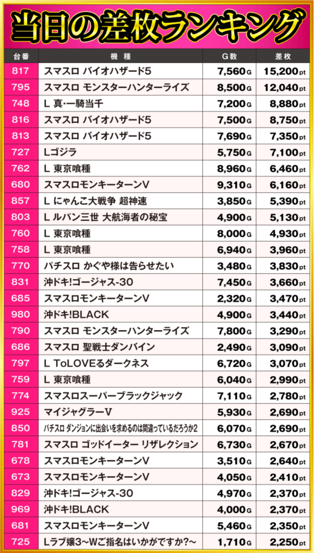 当日の差枚ランキング