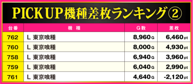 次にPICK UP機種を見ていこう。ハイスコアを連発させた『スマスロ バイオハザード5』は、全5台中4台がプラス差枚となる見事な結果に。さらに、『L 東京喰種』と『スマスロモンキーターンV』からは+6,000pt超が確認されており、それぞれのシマは常に活気に満ち溢れる一日となっていた。