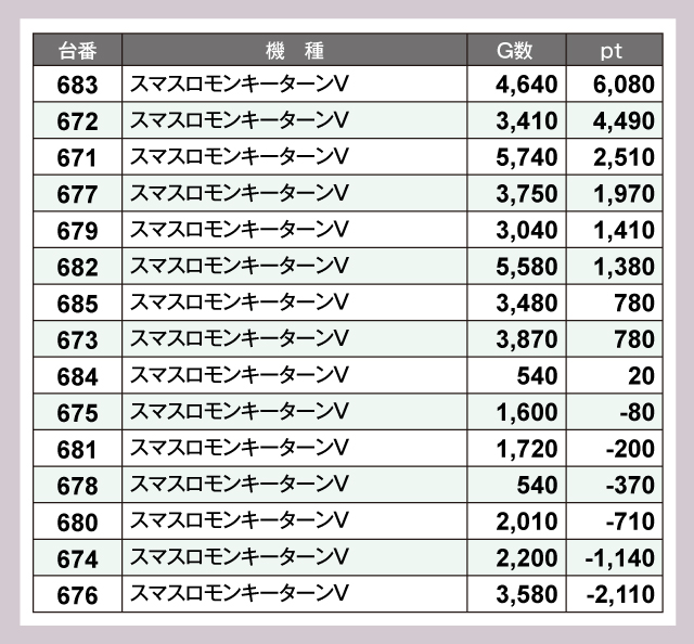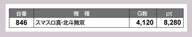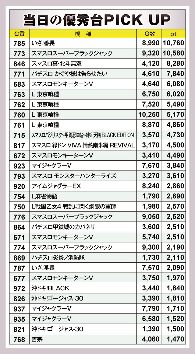 この日、強烈なインパクトを残したのは2台。『いざ!番長』785番台が+10,760pt、『スマスロスーパーブラックジャック』773番台が+10,580ptと誰もがうらやむ結果を残した。つづいて『スマスロ真・北斗無双』846番台が+8,280pt、『パチスロ かぐや様は告らせたい』771番台が+7,840pt、『スマスロモンキーターンV』683番台が+6,080ptと並ぶ。優秀台が続出する、非常に見応えのあるデータとなっていた。