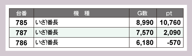 設置台数が多い『スマスロモンキーターンV』は15台中9台がプラス。1万pt超えの台が現れた『いざ!番長』は3台中2台がプラスと大活躍していた。