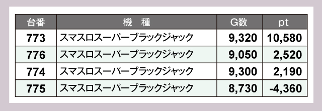 新台はもちろん、メイン機種での高実績が目立つ結果となっている。とくに注目なのは『スマスロスーパーブラックジャック』。1万pt超えをはたした773番台を筆頭に、高G数ばかりの人気ぶりで大きな成果をあらわしていた。