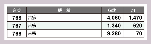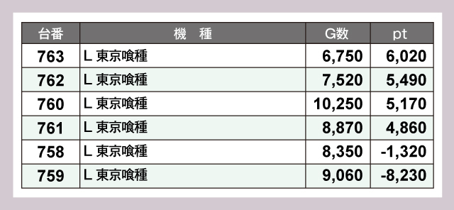 そして『L 東京喰種』は6台中4台がプラスpt。トータルptでも大きくプラスだが、G数の面でも1万回転オーバーの台が現れるなど、ホールの中心としての存在感を発揮している。
