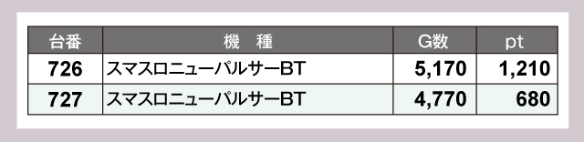 少数精鋭の『スマスロニューパルサーBT』と『吉宗』、『スマスロ真・北斗無双』は全台がプラスptで終えていて、ポテンシャルの高さがうかがえる。