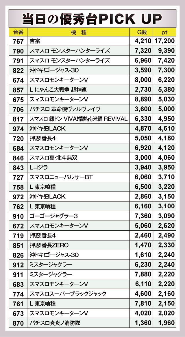 もっとも羽ばたいたのは『吉宗』767番台で、+17,200ptとなった。そして『スマスロ モンスターハンターライズ』790番台が+9,390pt、791番台が+7,420pt。『沖ドキ!ゴージャス-30』822番台が+7,300ptとつづいている。以下『スマスロモンキーターンV』674番台の+6,220ptなどなど、優秀台が並ぶ壮観なデータとなっていた。