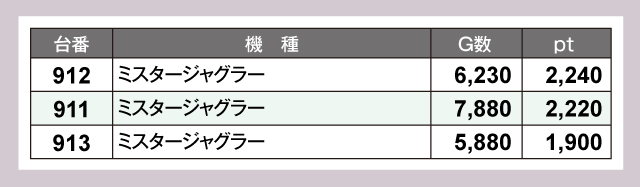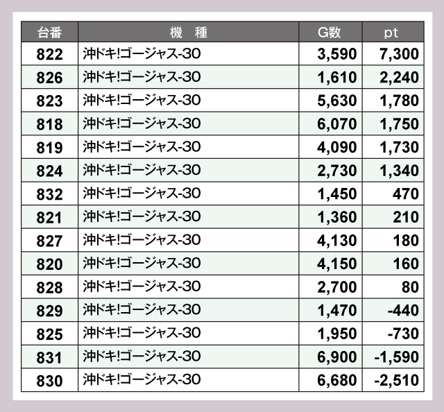 沖スロ30Φやノーマルタイプにも注目したい。『沖ドキ!ゴージャス-30』からは7,000ptオーバーが生まれ、『ミスタージャグラー』は全台がプラスptと実力を示している。