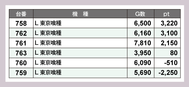 同店のメインとして好評稼働中の『スマスロモンキーターンV』と『L 東京喰種』がいずれも大活躍。大幅プラスptの台が多数飛びだし、ひときわ目立つ存在だった。