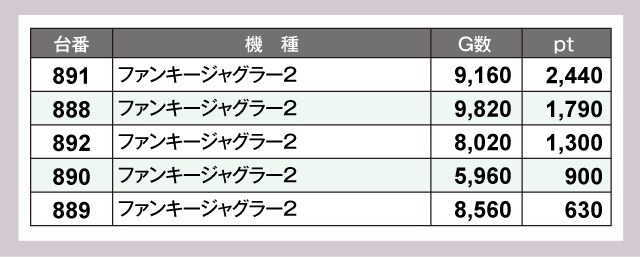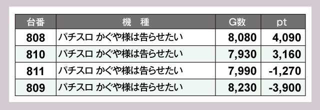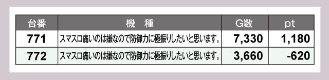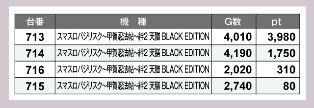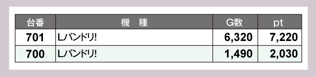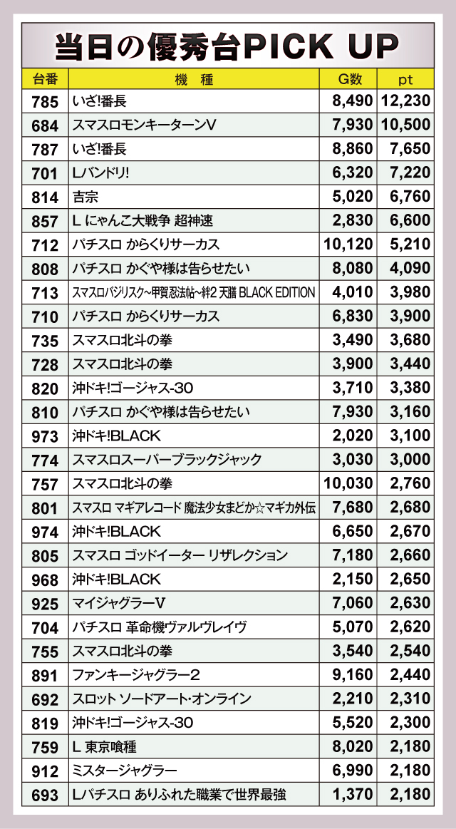 とくに目立っていたのは2台。『いざ!番長』785番台が+12,230pt、『スマスロモンキーターンV』684番台が+10,500ptと1万ptオーバーを達成している。そして『いざ!番長』787番台が+7,650pt、『Lバンドリ!』701番台が+7,220ptとつづく。以下にも『吉宗』814番台の+6,760ptなど、優秀台がズラリと並ぶ見事なデータとなっていた。