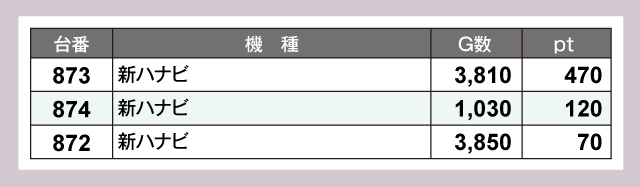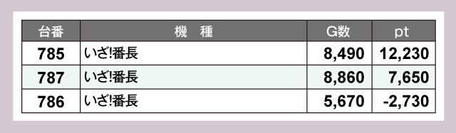 『いざ!番長』は3台中2台がプラスpt。くわえて785番台が1万ptオーバーなど、大きな成果をあげている。