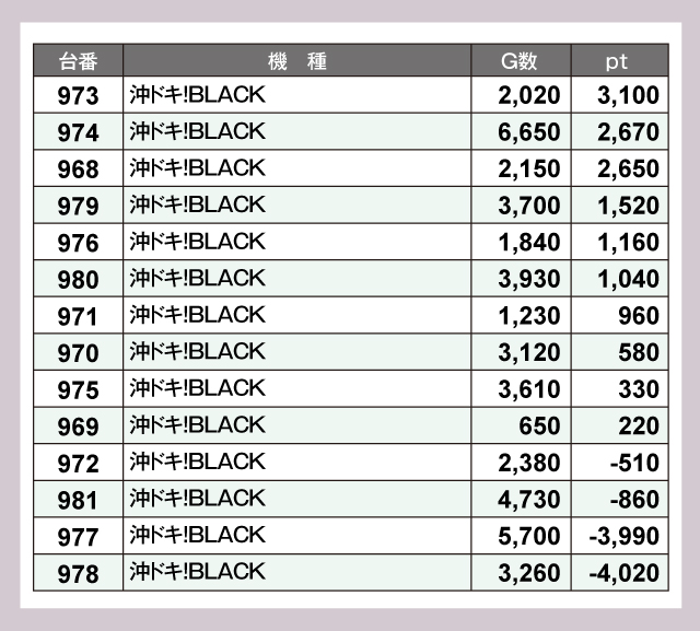14台設置の『沖ドキ!BLACK』は10台がプラスで、同店の中心機種として活躍していた。
