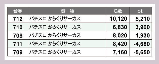 『パチスロ からくりサーカス』は5台中3台がプラス。いずれも高稼働で、1万G超えの台もあらわれ店内の盛り上がりに貢献している。