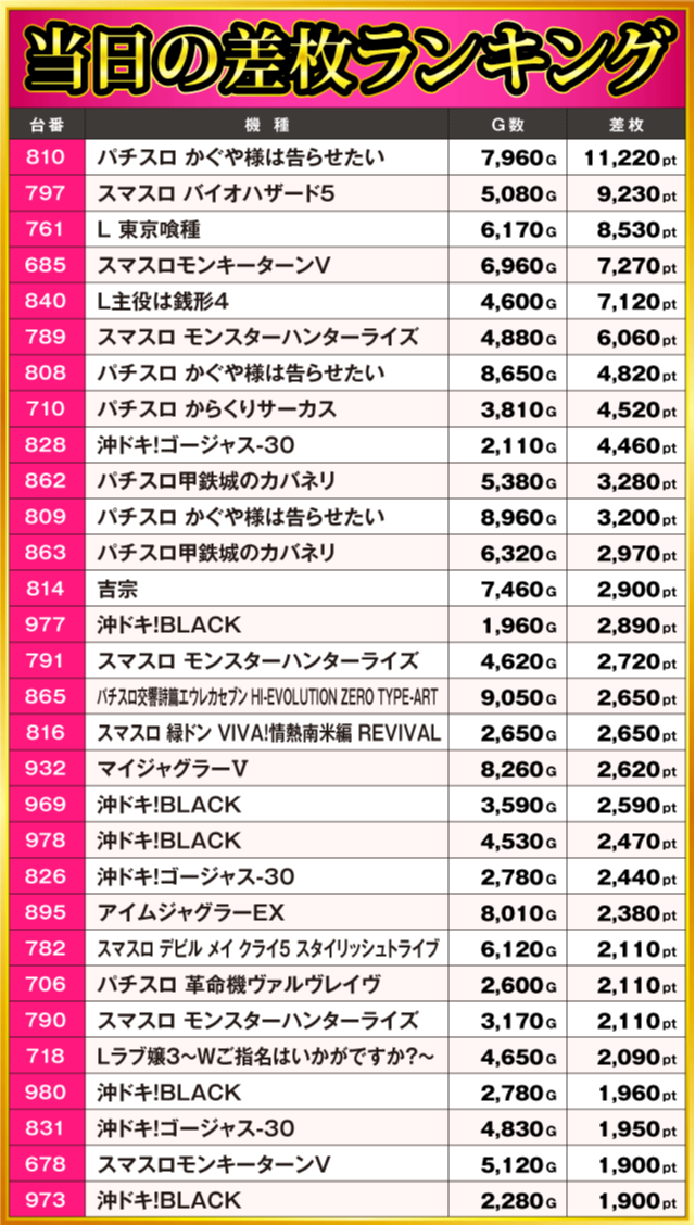 当日の差枚ランキング