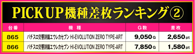 今回のPICK UP機種は全4機種で、なかでも目立っていたのが店舗中央に位置する沖ドキ!シリーズ。『沖ドキ!BLACK』と『沖ドキ!ゴージャス-30』を合わせた全29台中19台がプラス差枚となる見事な結果を残している。また、再導入された『パチスロ交響詩篇エウレカセブン HI-EVOLUTION ZERO TYPE-ART』が好成績を記録しているのも注目すべきポイントと言えるだろう。