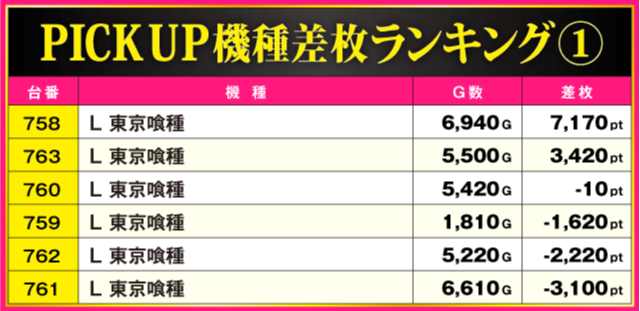 早速、店内状況をチェックしていくと、増台された『L 東京喰種』を筆頭に『スマスロ北斗の拳』や『スマスロモンキーターンV』、『いざ!番長』から多数の好成績が発生。また、『ハッピージャグラーVⅢ』や『新ハナビ』といったノーマル機、さらにはバラエティコーナーの少台数機種も大奮闘しており、広範囲に渡ってチャンスが潜んでいたのは間違いないだろう。