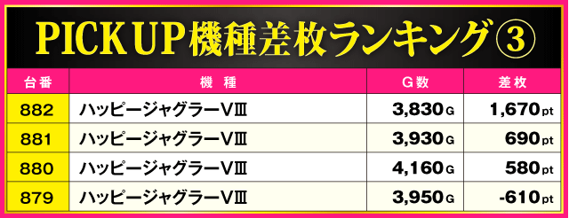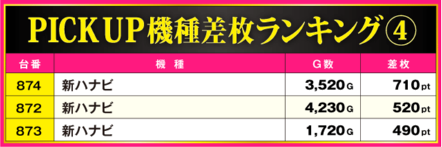 今回のPICK UP機種は全4機種で、差枚上位にランクインした台以外からも複数の好調台を確認。最終的に4機種トータルの全16台中11台がプラス差枚となっているだけに、それぞれのシマは常に活気とファンの笑顔に溢れ返っていた。