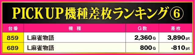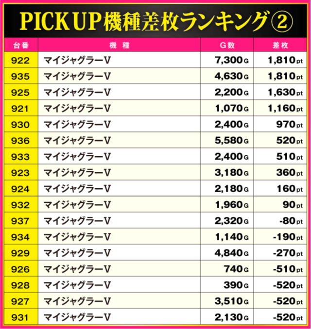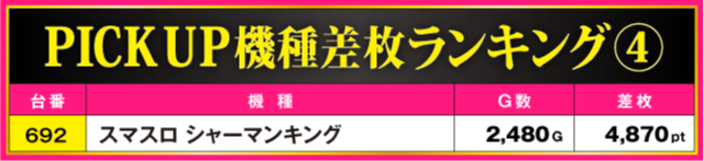 今回のPICK UP機種は全4機種。『沖ドキ!BLACK』は977番台の+4,050ptを筆頭に全14台中11台、『マイジャグラーⅤ』は半数以上の台がプラス差枚となる見事な結果を残している。さらに、『スマスロ シャーマンキング』が+4,870ptを記録するなど、少台数機種からもしっかりと好成績が飛び出し店内を盛り上げていた。