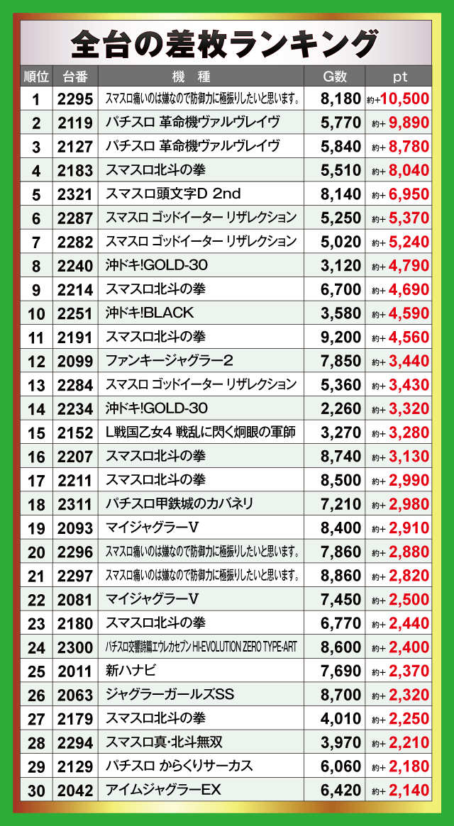 朝から300人以上のファンが集まり大にぎわいでスタートした「楽園沼津店」。全台の差枚ランキングをチェックしてみると、いまだ人気が衰えない『パチスロ 革命機ヴァルヴレイヴ』では2119番台・2127番台が9,000pt超、『スマスロ北斗の拳』2183番台で8,000pt超など、PICK UP機種以外でも多数の好調台を確認できた。