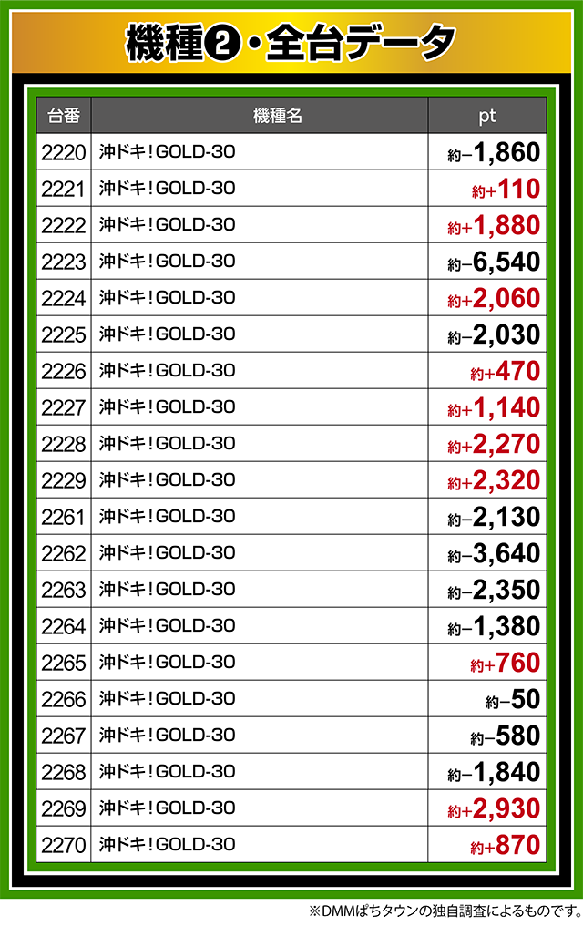 10台がプラスとなった『沖ドキ!GOLD-30』では、4台が約+2,000pt以上。