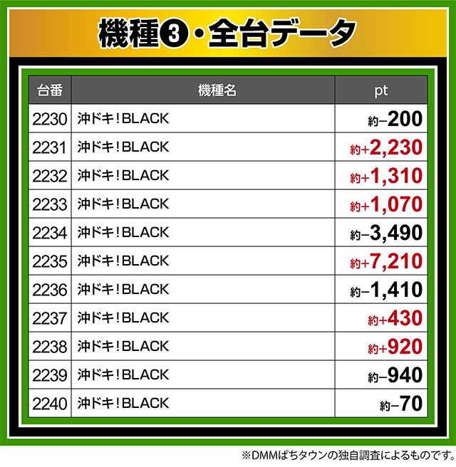 『沖ドキ!BLACK』も6台が結果を残し、2235番台は約+7,210ptを記録した。