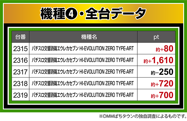 『パチスロ交響詩篇エウレカセブン HI-EVOLUTION ZERO TYPE-ART』は5台中4台がプラスとなり、2316番台は約+1,610pt。