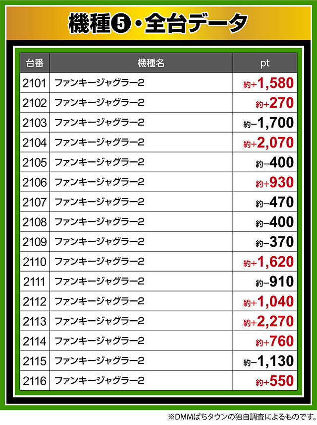 『ファンキージャグラー2』も活気が大きく、2104番台と2113番台が約+2,000ptオーバー。