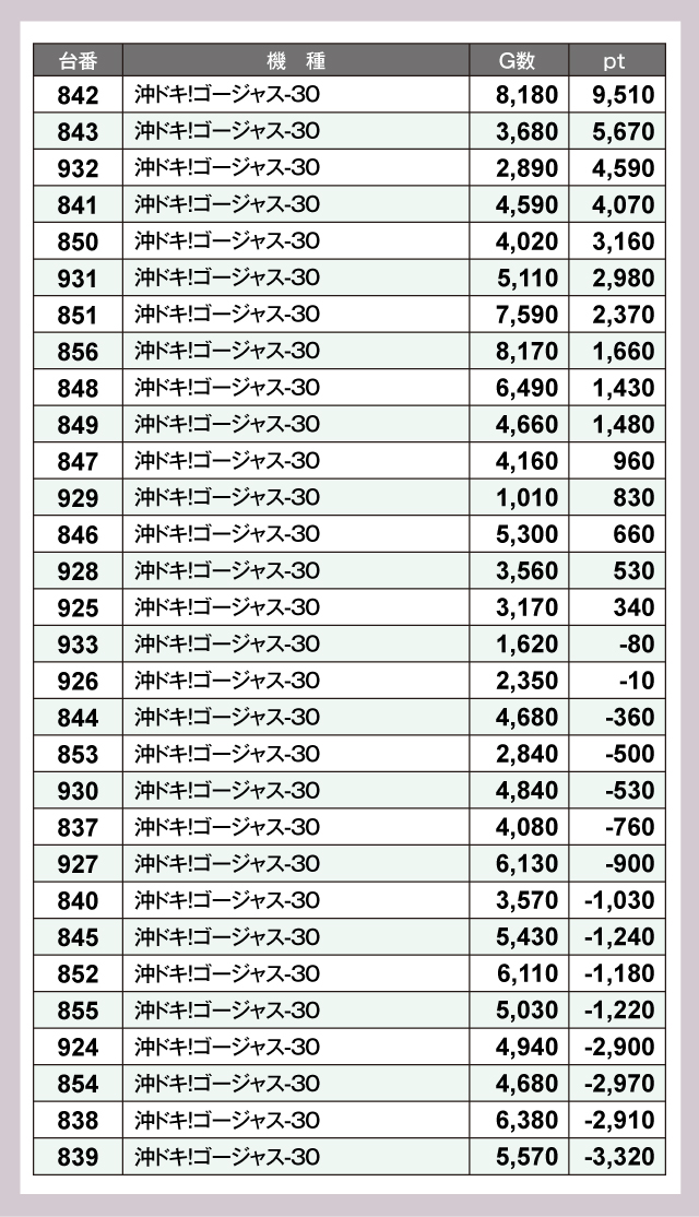 なんと1万ptオーバーが3台も出現。『パチスロ かぐや様は告らせたい』1061番台が+14,690pt、『スマスロ 緑ドン VIVA!情熱南米編 REVIVAL』768番台が+11,250pt、『スマスロ ゴッドイーター リザレクション』765番台が+11,250ptと誰もがうらやむ結果を残している。そして『スマスロ デビル メイ クライ5 スタイリッシュトライブ』719番台含む4台が9,000pt超えを果たしているなど、非常にハイレベルな攻防が繰りひろげられていた。