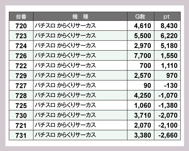 12台設置の『パチスロ からくりサーカス』は6台がプラスpt。しっかりとG数が回されている台を中心に、プレイヤーの期待に応えている。