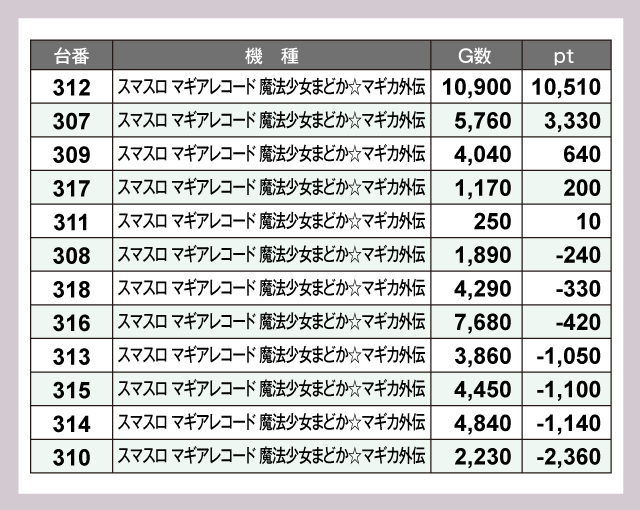 『スマスロ マギアレコード 魔法少女まどか☆マギカ外伝』では312番台が1万G超えを果たし、なおかつ1万ptオーバーも達成している。