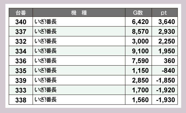 9台設置の『いざ!番長』は5台がプラスpt。そのうち4台が4桁プラスの成果をあげていた。