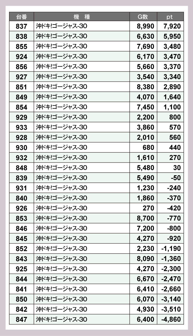 『沖ドキ!ゴージャス-30』は30台の大量設置で、15台がプラスptとなっている。7,000pt・5,000ptオーバーの台も誕生し、同点の盛り上がりを牽引していた。
