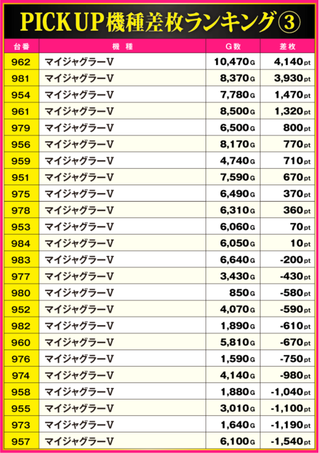 続いてPICK UP機種の状況をチェックしていこう。『スマスロモンキーターンV』からは+7,630pt、『スマスロ デビル メイ クライ5 スタイリッシュトライブ』からは+4,450ptが発生。さらに『マイジャグラーⅤ』は、962番台の+4,140ptを皮切りに半数の台がプラス差枚となる圧倒的な安定感を披露している。