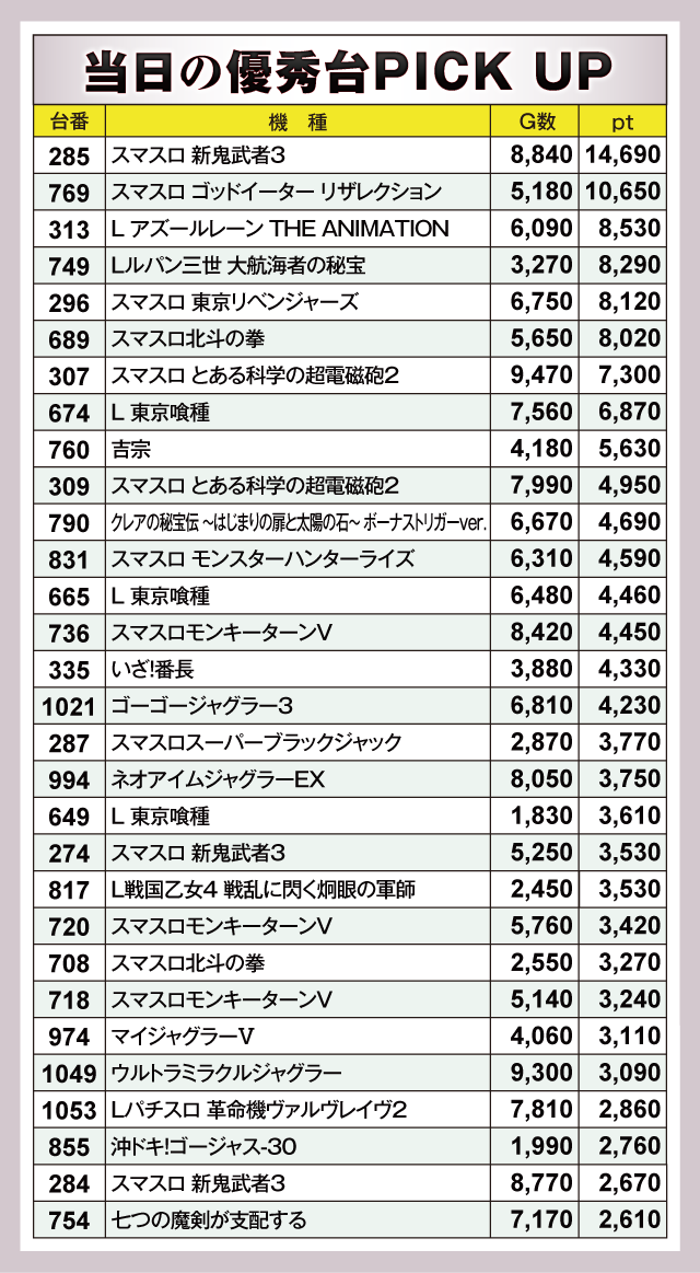 『スマスロ 新鬼武者3』285番台が+14,690pt、『スマスロ ゴッドイーター リザレクション』769番台が+10,650ptと、1万ptオーバーが2台あらわれ店内を彩っていた。そして『L アズールレーン THE ANIMATION』313番台の+8,530ptを筆頭に、8,000ptオーバーが4台ならぶ。以下にも『スマスロ とある科学の超電磁砲2』307番台の+7,300pt、『L 東京喰種』674番台の+6,870ptなどなど、圧巻のptが連なる素晴らしいデータとなっていた。